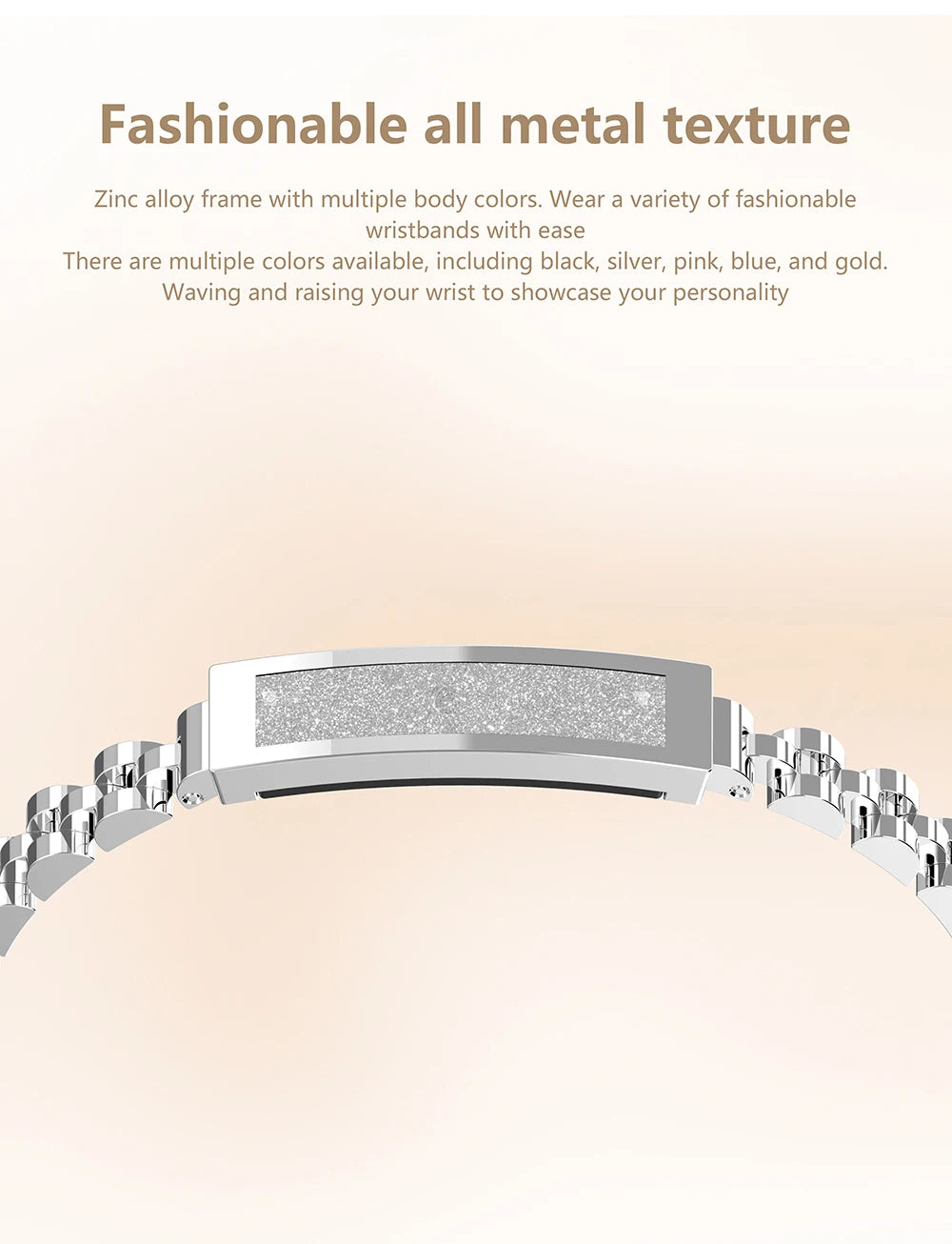 Zinc alloy frame with multiple body colors.Wear a variety of fashionable wristbands with ease.There are multiple colors available, including black, silver, pink, blue, and gold. Waving and raising your wrist to showcase your personality